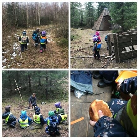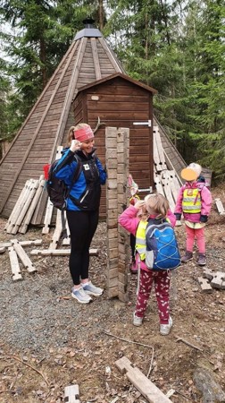 Lavvoen vår ligger i skogen bak Stange skole. Supert å gå hit på tur, og godt å kunne gå inn i lavvoen og varme seg litt. Her har vi skogen som lekeplass, og vi har også et laftesett til lek og bygging. Utedo er også på plass. Det er litt for langt for de minste barna å gå hit, men grupper fra Regnbuen er også på besøk av og til.